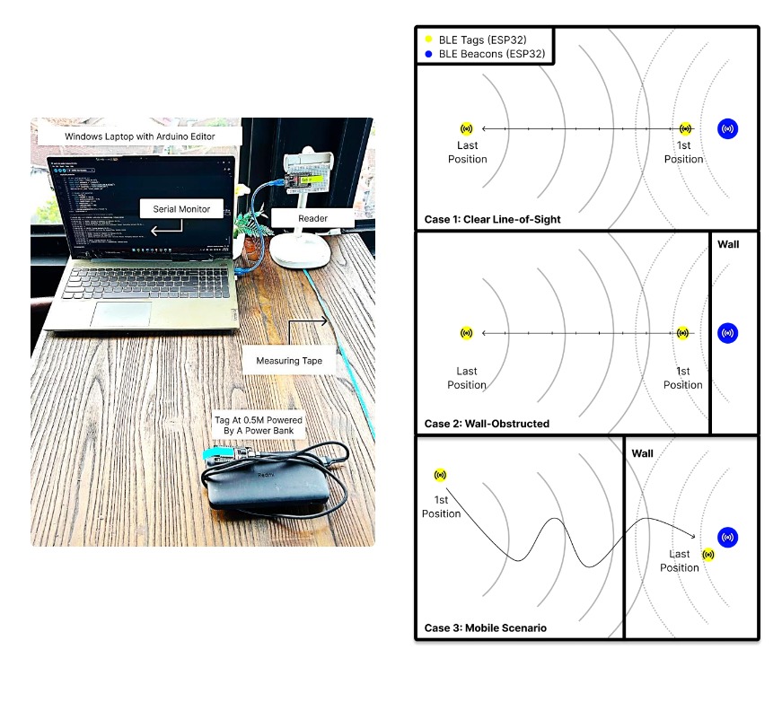 Using a log-distance path loss model with a reference RSSI of −47 dBm at one metre and a path loss exponent of 2, the authors found that the ESP32 BLE system could reliably estimate distances within four metres under line-of-sight conditions, with less than 25 per cent error. Beyond five metres, however, the signal became unstable and led to overestimation of distances, particularly in obstructed environments. A wall caused an immediate signal drop of 6 dBm even at one metre, and packet loss rose from zero per cent at short distances to around fifty per cent at 8.5 metres. Mobile tracking showed irregular RSSI jumps, making movement detection inconsistent.